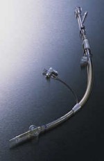 Krok 3: Vložte TRTUNPH spolu s diktátorem ("zaváděčem") a přes zaváděcí drát jej zaveďte do aorty, až po úroveň první zářezové značky. Podélnou linii na kanyle nasměrujte k noze pacienta. |